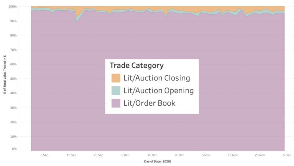 Notably the auction (particularly at the close) represents a much smaller slice than we typically see in Europe, where so much passive trading is benchmarked.
