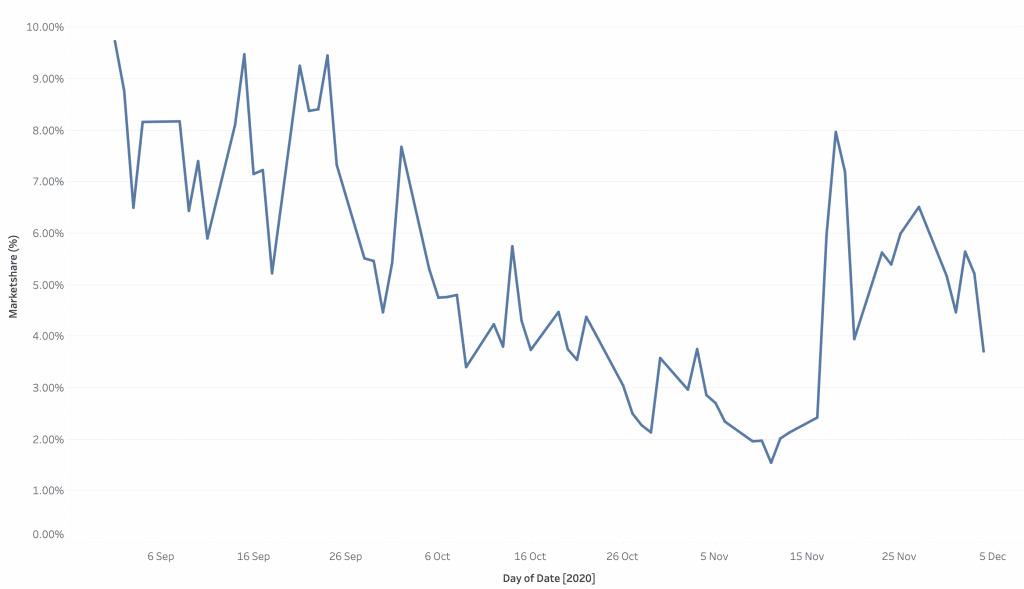 Take a look at our first chart today. This shows the market share of Tesla across the whole US equity market over recent months.