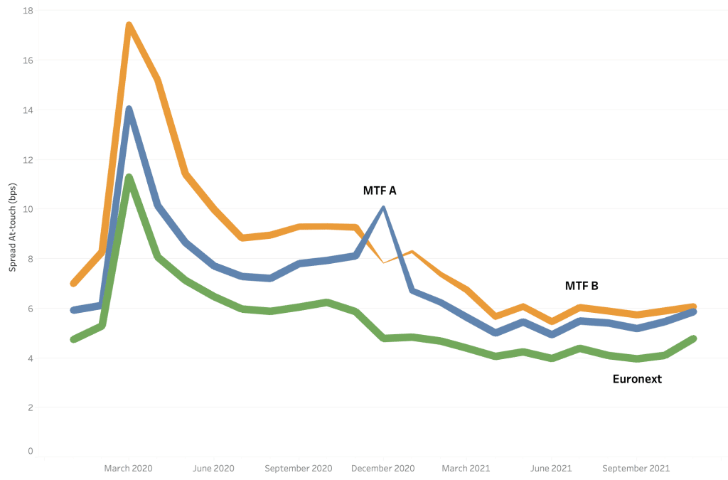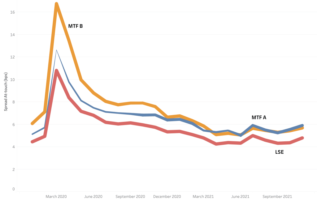 Unsurprisingly, we always observe the primary exchange as having the tightest spreads overall and we have shown two anonymised competing MTFs for comparison.