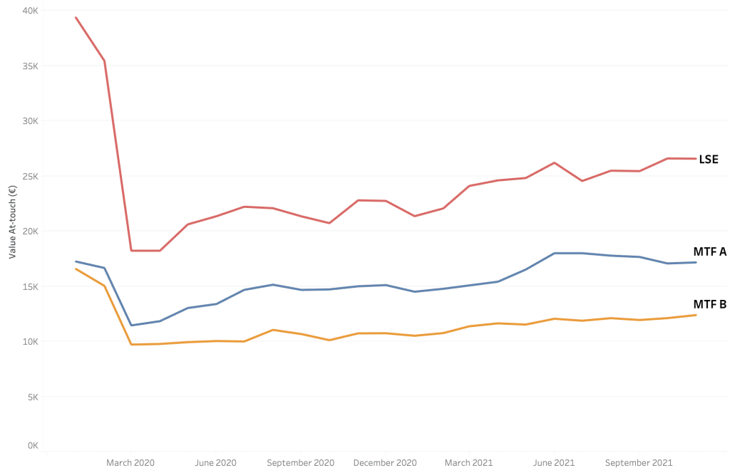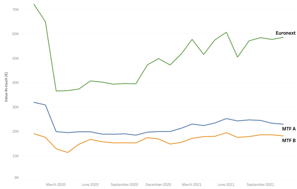 The final chart tracks the same metric for Italian blue chips. The Q1 2020 volatility triggers a similar decrease in available liquidity on all venues, but the MTFs transition through the Brexit-induced changes are barely noticeable as all venues gradually recover, but, like the UK, to nowhere near where they were before.