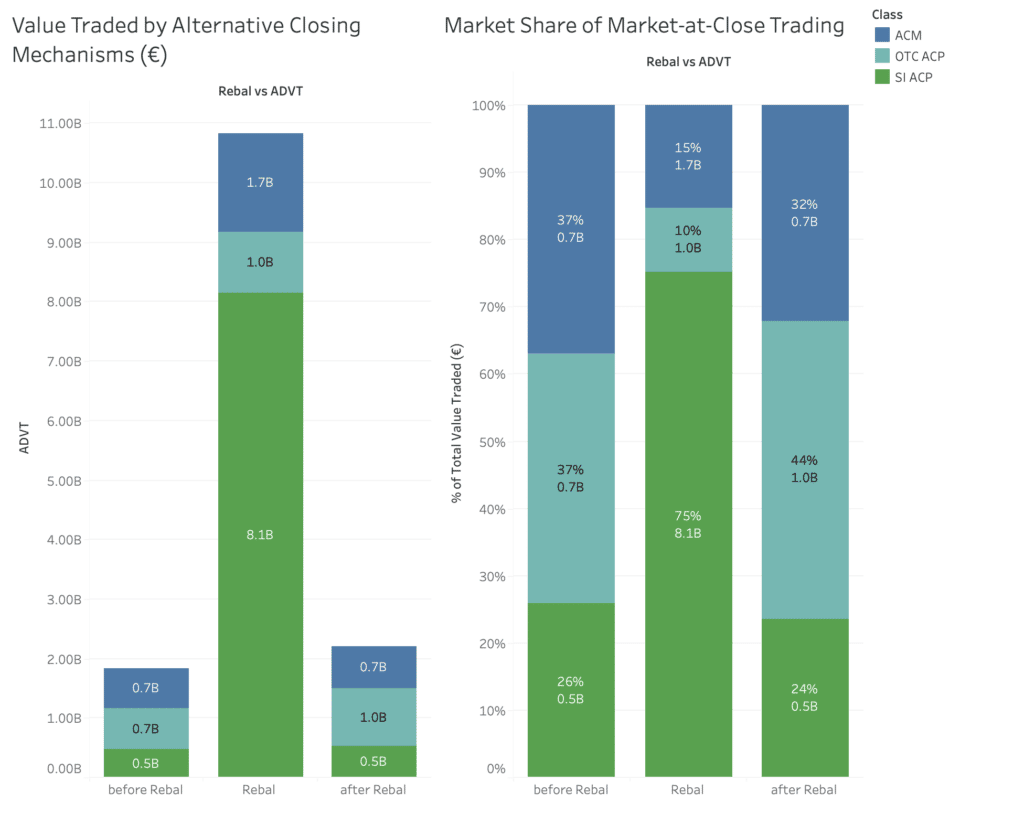 These two charts (Figure 2) examine the value traded using these alternatives to the Primary closing auction and then their relative share. Aquis and Cboe have innovative new approaches to compete for this closing flow and this is covered by the ACM category. Our team further identified that a certain amount of volume is reported OTC shortly after the markets close at prices matching the Closing Price. They saw and captured this same activity in SI reports, and as you can see on the day of the MSCI rebalance it was significant.