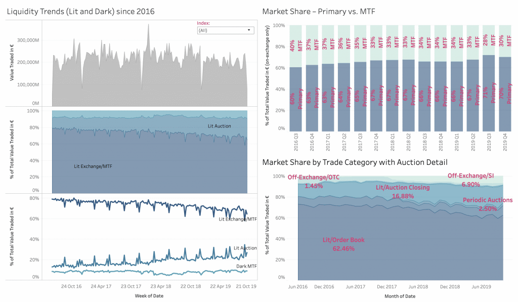 XYT View provides a meaningful range of market overview metrics and has been developed to fill the information gap caused by the withdrawal of previous alternatives. Delivered via interactive dashboards, users can observe changes in displayed liquidity, periodic auctions, opening and closing auctions across the entire equity and ETF trading landscape in Europe.