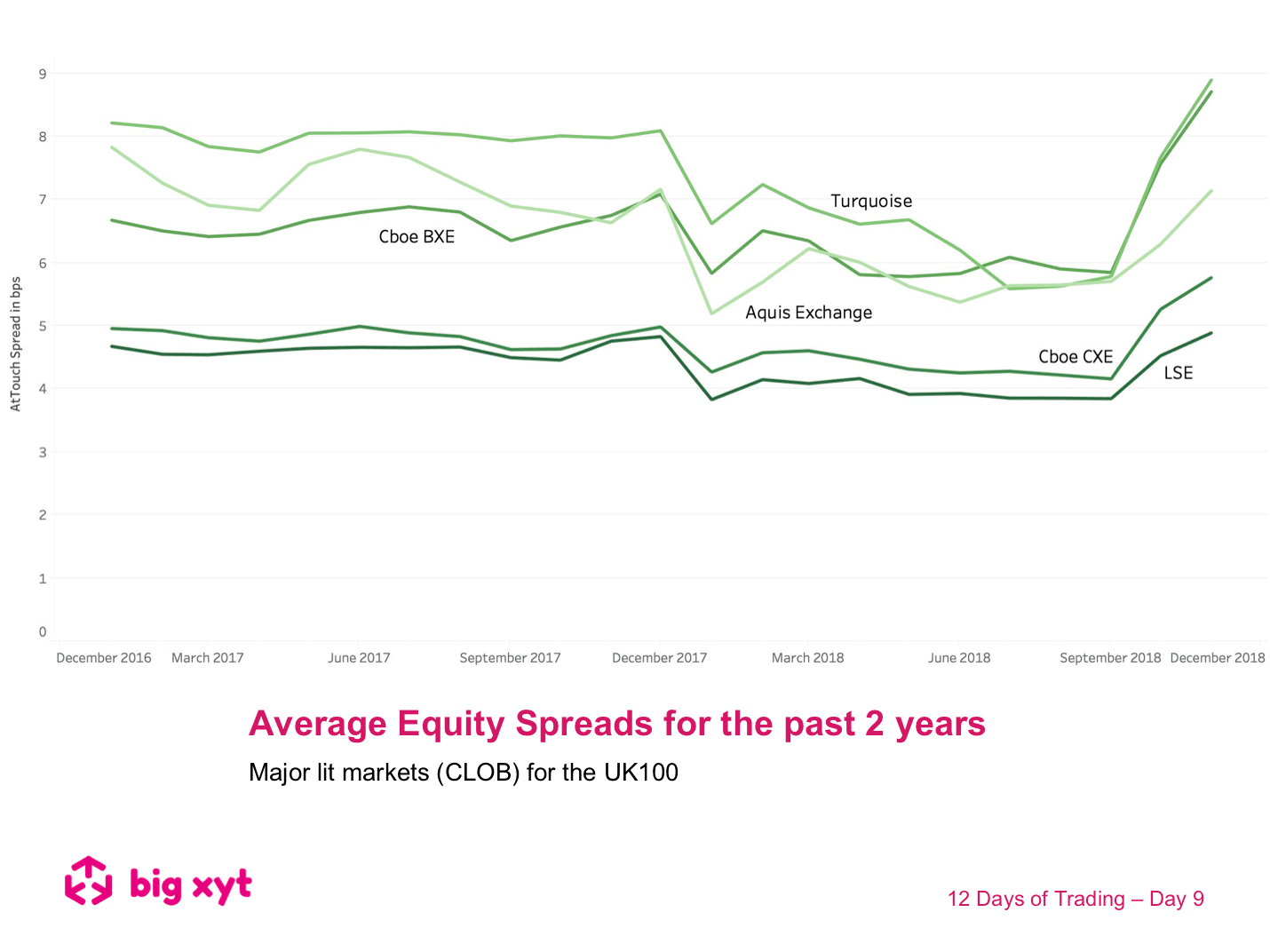The chart shows at touch time-weighted average spreads for blue chip UK stocks since December 2016