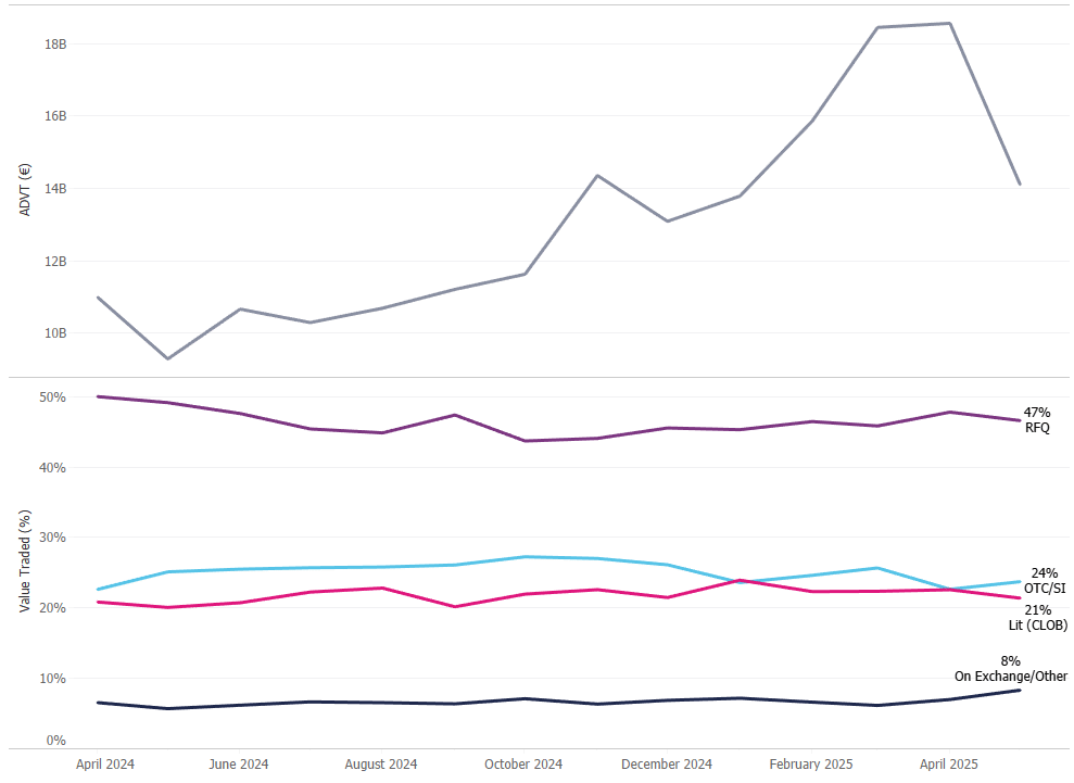 - The exchange-traded nature of ETFs makes it “almost ridiculous that 70% of the activity happens on RFQ/OTC”