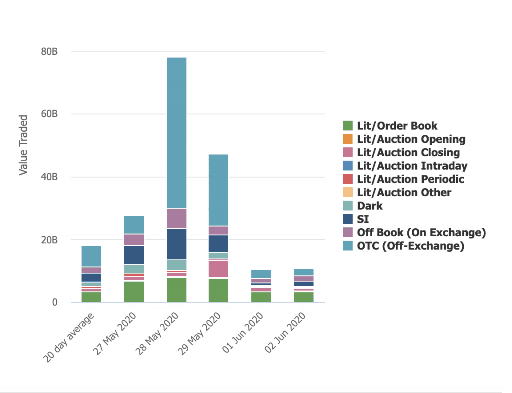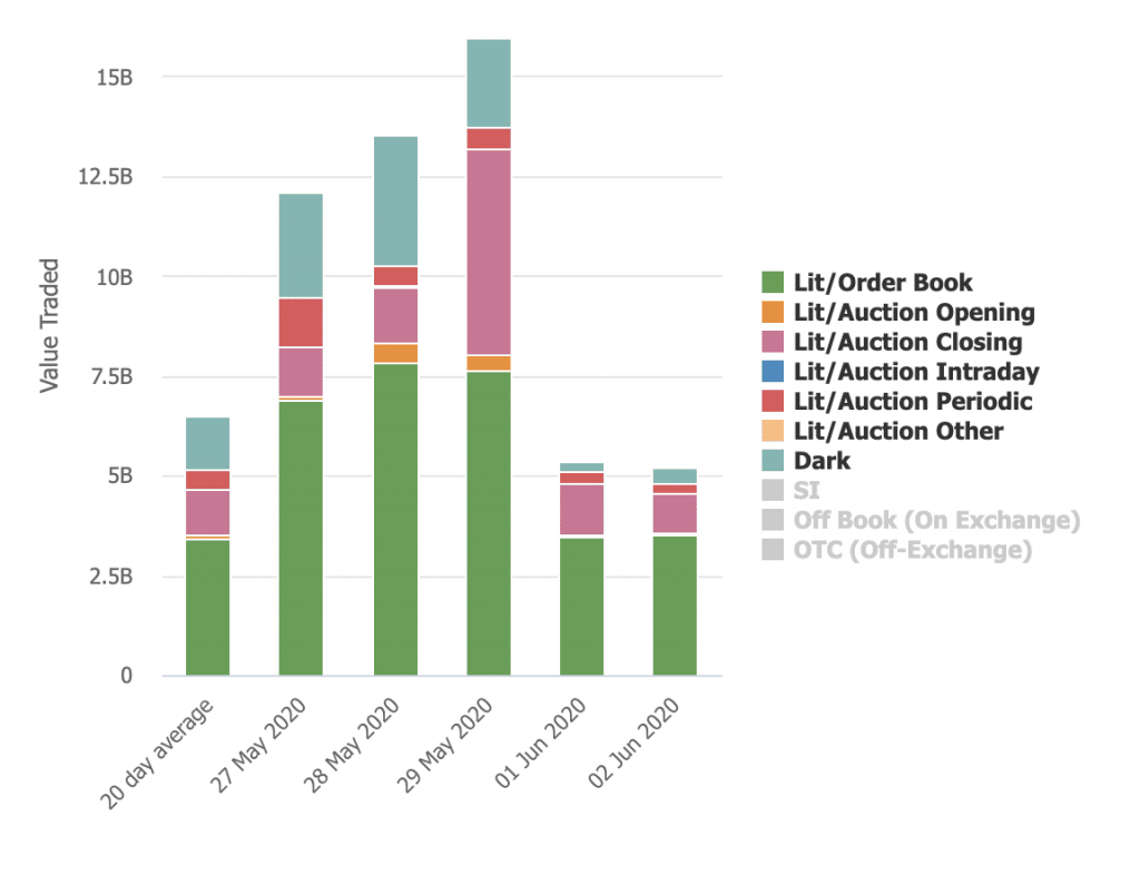 This chart additionally shows how the turnover ( on exchange, lit & dark ) grew over the previous days with a peak particularly in the closing auction volume on the 29th before dropping back to more normal levels.