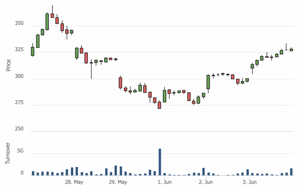 Finally & perhaps most significantly, our original scatterplot allowed us to identify the 511bps  price difference between the lit volume weighted average price ex auction (VWAP) of 286.215  and the Close itself at the low of the day of 271.60. For those wondering how the stock opened the next day, the opening auction was 278.2. In fact, as we see above, the close on the 29th was the bottom of a 6 day trough. 3 days before & after that event the stock was 20% higher!