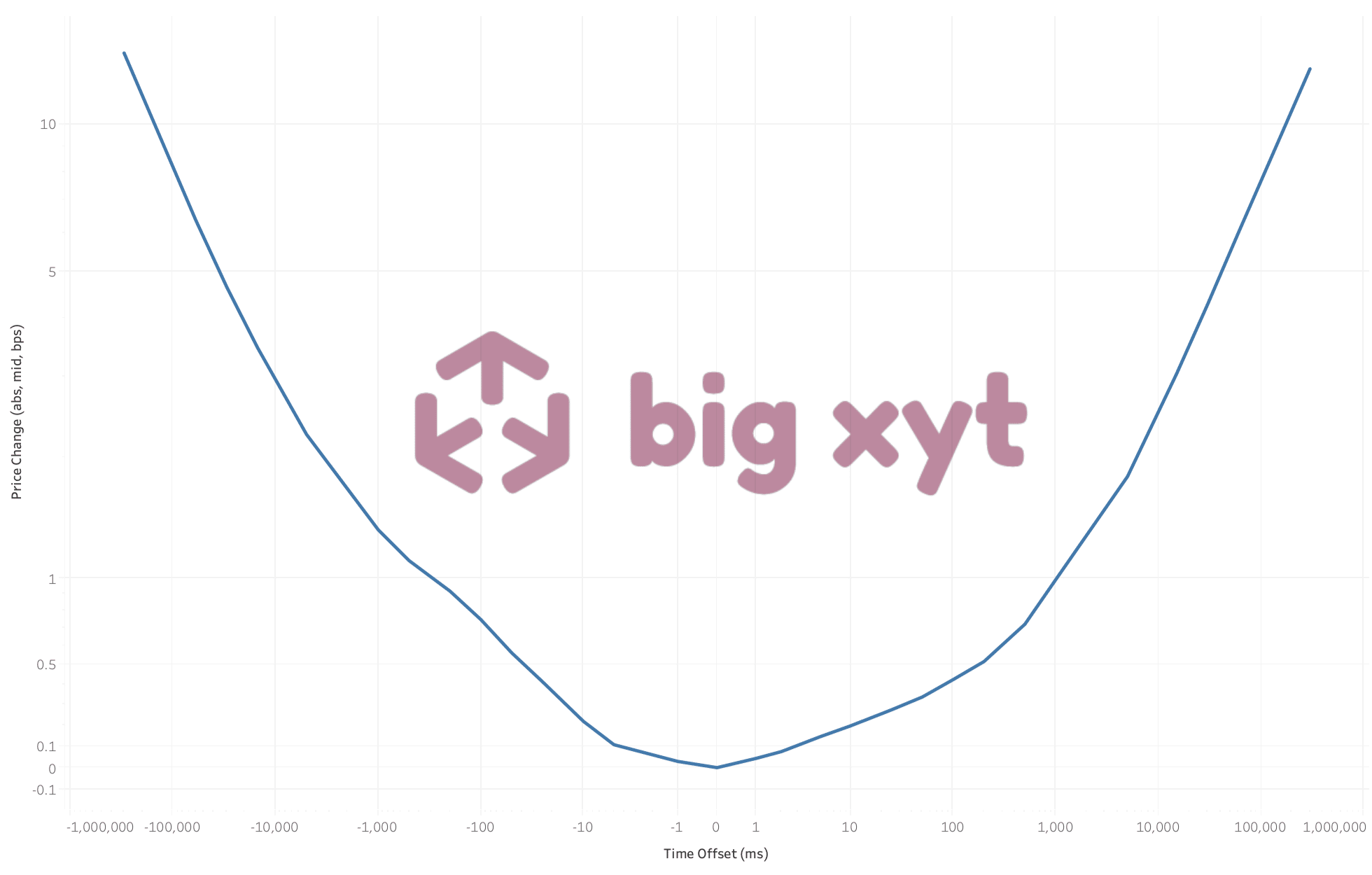 - Across all trades within a given date range (e.g. a month) we aggregate the results for each offset using a volume-weighted average of the measured price changes (of the mid prices).
