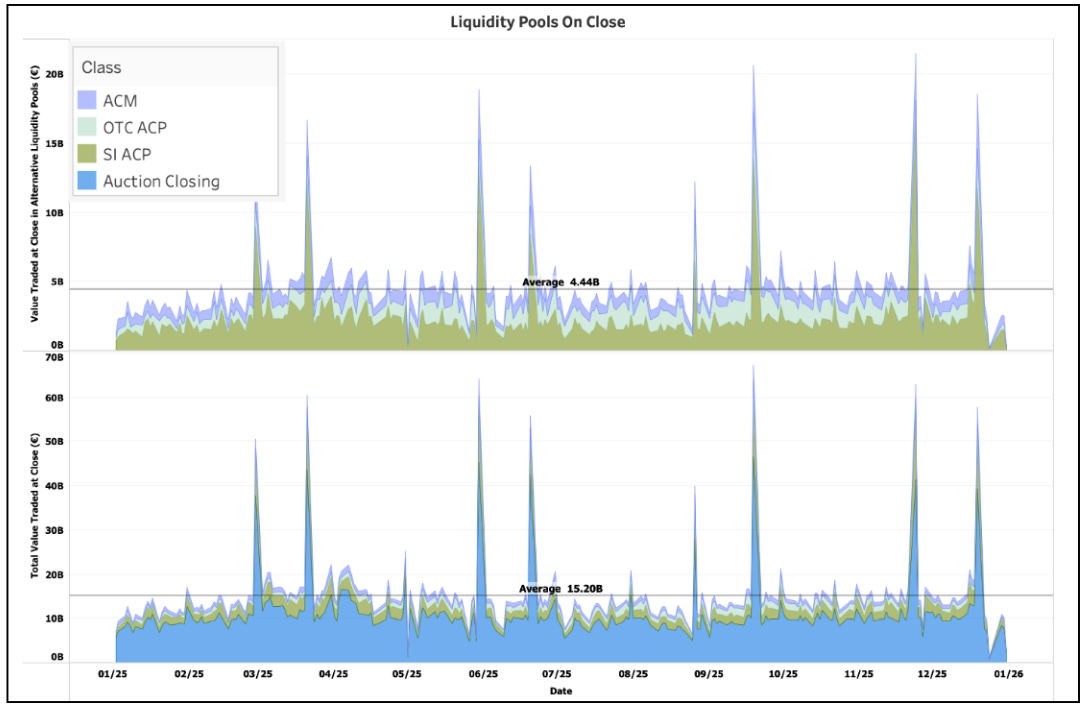 The corresponding equity market closing auction volume is another key measure, ranging from €39 billion in December to €46 billion in September as the index is reconstituted at the close.