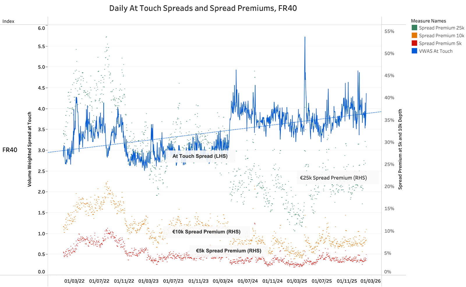 A highly revealing moment in this chart comes in April 2024. Before that date, the €25,000 premium drifts gradually upward, but from the 2nd onwards, there's a distinct shift in the baseline. The at-touch spread becomes noticeably more volatile, and the premium sits persistently higher. In fact, it did.