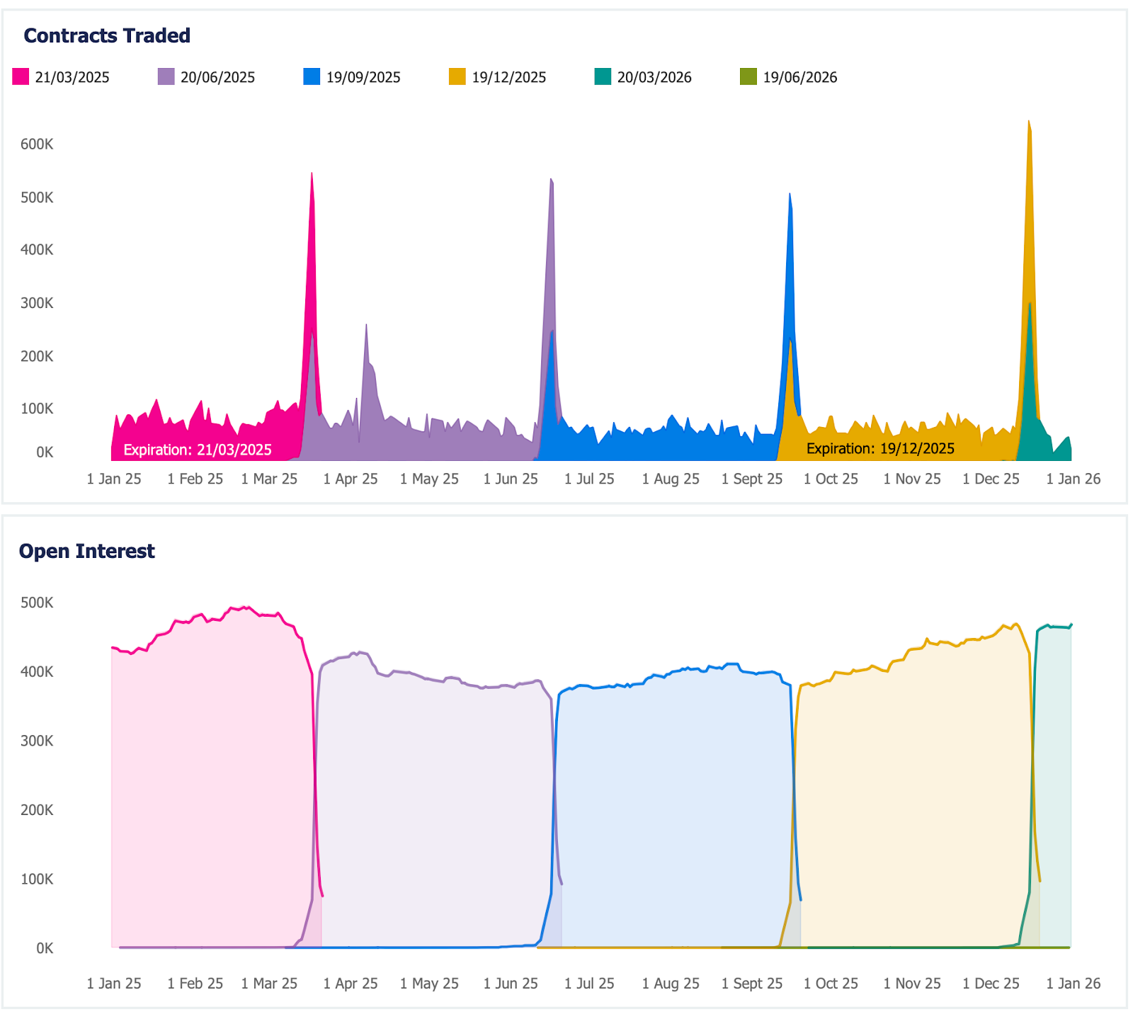 Open Interest data provides insights into equity flows. It consists of the aggregate position of distinct participant types: CTAs with unhedged exposure to futures prices, real money managers using futures to hedge their underlying equity strategies, delta-one desks and APs managing tracking error and reconstitution, among other activities that keep an index and its underlying in sync. This reflects risk sentiment—higher Open Interest and higher contract volume indicate higher volatility. On expiry, the aggregate position must be closed through the combined actions of participants: offsetting futures positions, rolling into the next contract period, or settling and unwinding any hedge, facilitated by liquidity providers. These dynamics are directly connected to the equity market and trigger very high volumes, especially during expiry day closing auctions.