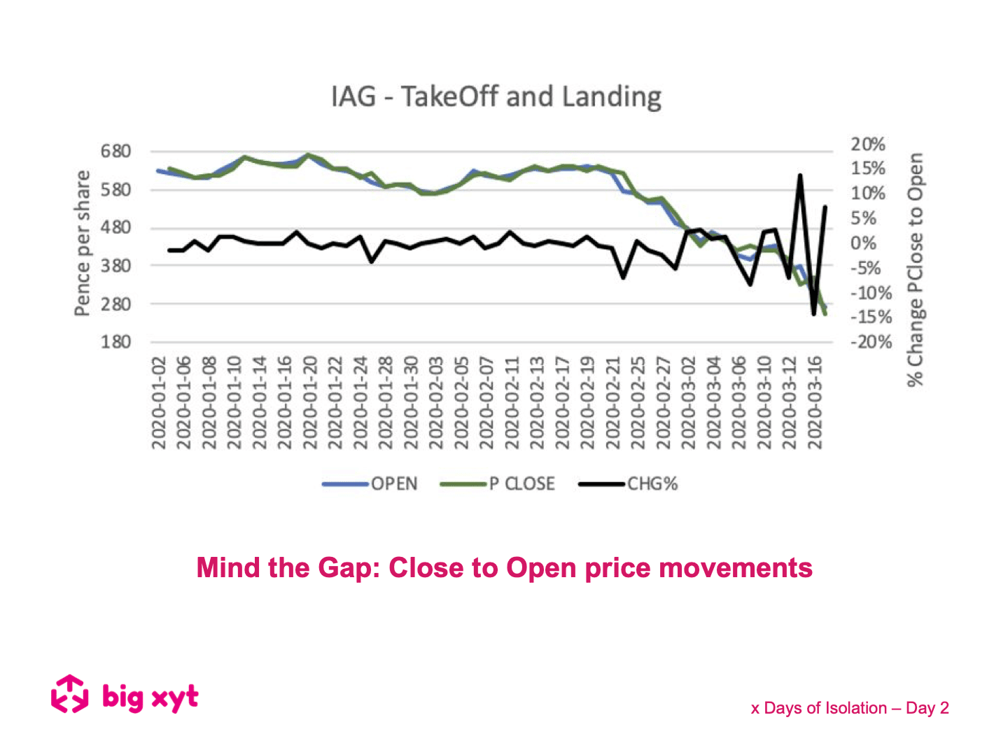 We have looked at the overnight gap between the Close and the Open in European liquid names over the past few weeks, and discovered some alarming data. For the most liquid 600 names, the average price change between the previous close and the open price increased from around 60bps in January/February to nearly 2.5% over the last three weeks. The graph below shows IAG.L, the owner of British Airways and Iberia, and a name at the heart of the travel and tourism storm. The opening price on January 2nd was 629p and now it is trading a little over 210p (it’s been lower), a fall of over 65%. Analyst consensus unanimously agree it is a strong buy with a target price over 450p, reflecting sentiment led sell offs and rallies.