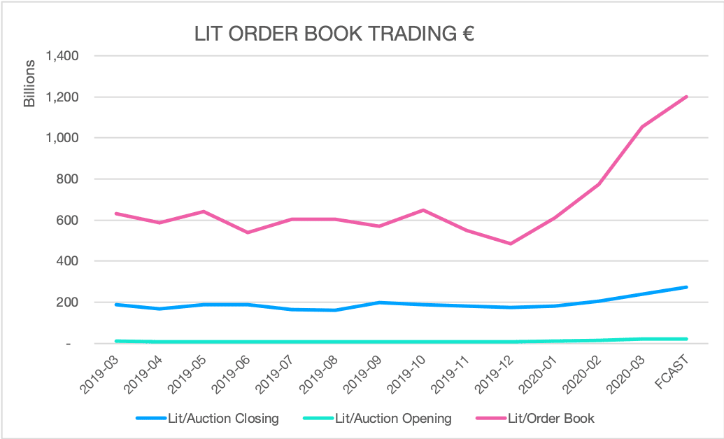 We mentioned earlier in the week that volume was returning to the lit order books from other types of trading venue – such as the end of day auctions. Just taking trades executed electronically on lit markets, we find that volumes increased from an average of 37 B€ per day in the last nine months of 2019 to 68 B€ per day in March, a rise of 93%. Intraday volumes lifted from 26 B€ to 57 B€, (104%) and the Closing auctions jumped from 8 B€ to 12B€ or 52%. Even the unloved Open auctions have increased volumes by 50% to a useful 1.2 B€ per day. Intraday trading on the order books is set to exceed 1.2 T€ in March, 48% higher than the previous record in October 2018.